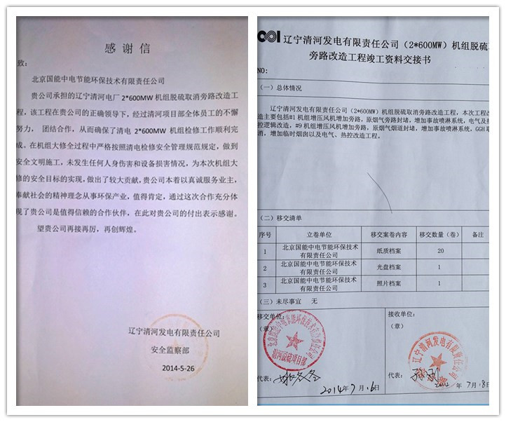 在公司總部的正確領(lǐng)導(dǎo)下,經(jīng)過清河EPC旁路改造項(xiàng)目部全體成員的共同努力,7月18日,遼寧清河發(fā)電有限責(zé)任公司業(yè)主代表在竣工資料交接證書上簽字,標(biāo)志著我公司承擔(dān)的遼寧清河電廠2*600MW機(jī)組脫硫取消旁路改造工程正式竣工驗(yàn)收,成功打響了我司在中國(guó)電力投資集團(tuán)的第一槍。