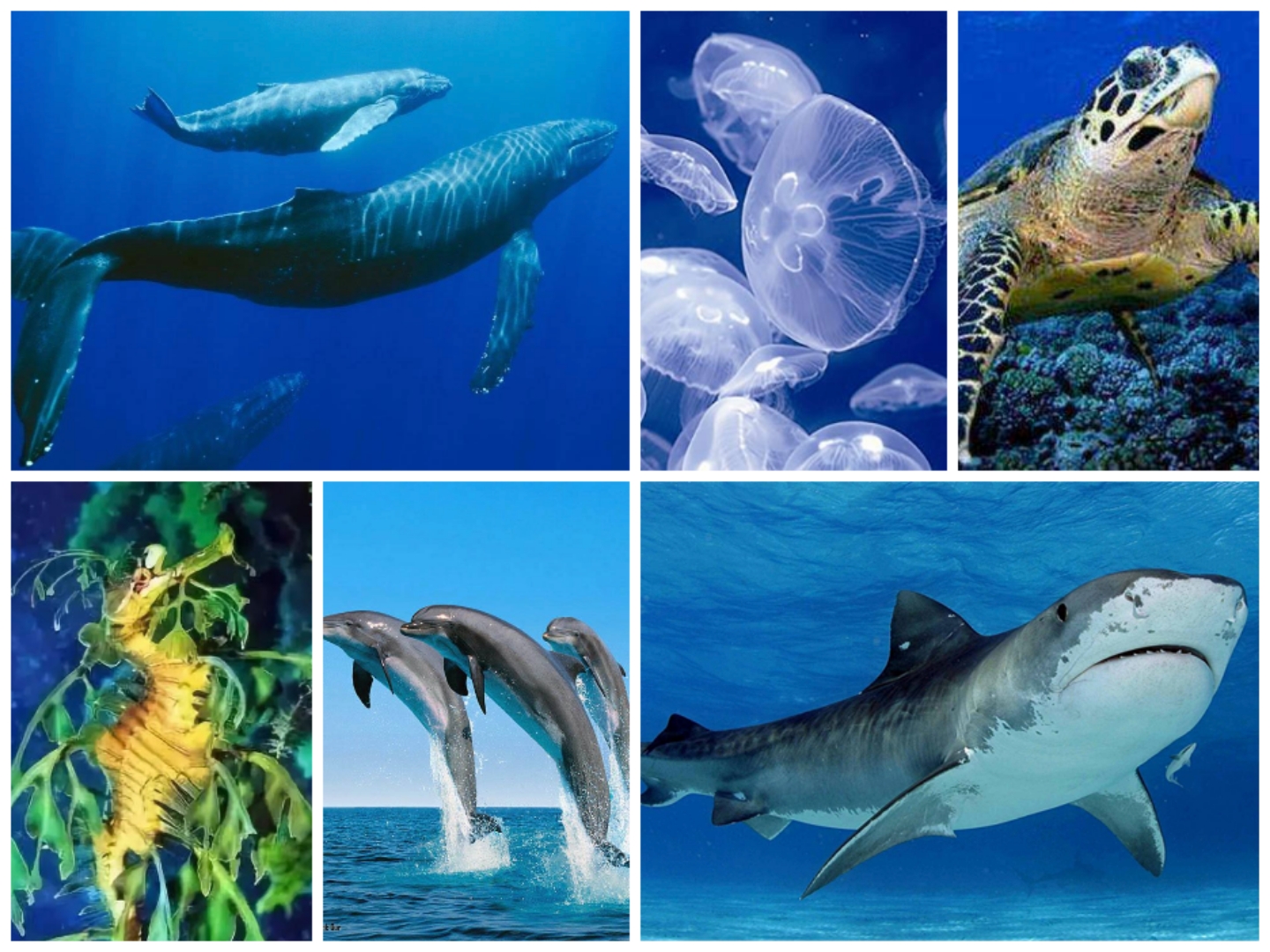 海洋動物 藍鯨、抹香鯨、海豚、海蛇、海龜、彈涂魚、蝠鲼、電鰩、鯊魚、蝴蝶魚、珊瑚魚、翻車魚、蝦蟹、藤壺、海兔、裸海蝶、紅魴魚、比目魚、海螺、扇貝、螃蟹、龍蝦、鯊魚、蝠鲼(重復)、姥鯊、海豚、抹香鯨、海象
